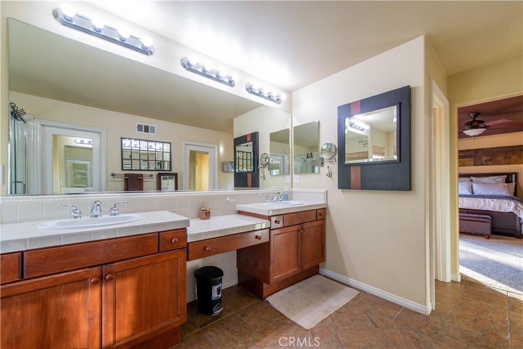Gorgeous Executive Home located in the highly desirable gated community of Greer Ranch located on a quiet cul-de-sac. Pull up to the driveway with custom pavers and take in the view of the luscious landscape and beautiful private covered flagstone courtyard. Once you enter the home, your greeted by the beauty of the laminate flooring, cathedral ceilings and the exquisite custom wrought iron that runs the length of the loft wall. Enter thru the glass double doors to the office with high ceilings and custom lighting. The family room windows have black out shades for those warm days and privacy. The kitchen has upgraded cabinets with pull out drawers, large eat at island, a pantry, and a ton of kitchen cabinet space. There is a bedroom downstairs with a walk-in closet located next to a full bathroom for family and guests. Upstairs you will find a huge open loft with a lovely fan and view. The master suite has a spacious retreat area and a master bath that includes a jetted tub and dual sinks with large walk-in closet with mirrored doors. Sliding glass doors off master lead out onto your balcony to take in the lovely view. There are 3 more good sized bedrooms upstairs, all with fans and window coverings. Enjoy the tropical paradise backyard with over $100,000 spent on pool and spa with waterfall and newer heater and custom landscaping, including stamped concrete and firepit. The 4 car tandem garage has storage racks and epoxy floor. Community includes 24 hour guarded gates, clubhouse, playgrounds, pool, basketball court and more.