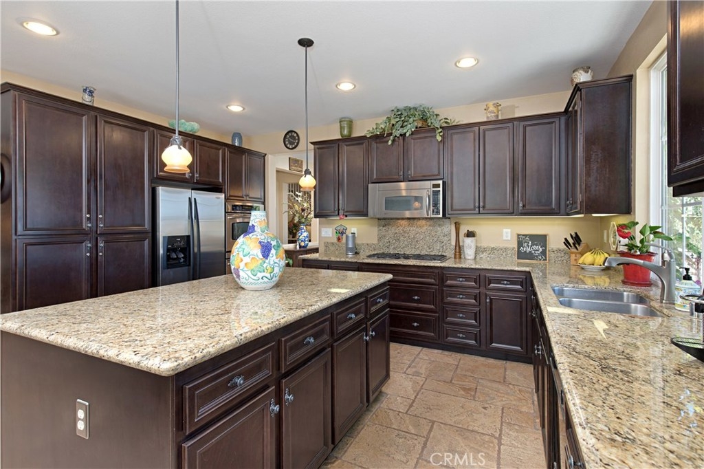 This Tuscan inspired home, located at the end of a cul-de-sac offers complete privacy while resting at one of the highest points of Greer Ranch, offering breathtaking Eastern views. Approaching the home be greeted by the manicured grounds dotted with olive trees. Walking up to the home, the 2 story turret shades the front door & adds an elegant impression of what awaits inside. Once inside, the lower level of the home offers Versailles laid travertine stone floors, while the upper level offers new laminate wood floors. The formal living & dining room sit at the back of the home with large windows offering captivating views. Continuing into the living area of the home, the family room offers a gas fireplace encompassed by a custom built-in. The kitchen features richly stained cabinetry with granite counter tops & GE Profile appliances. There is also a full bed & bath downstairs. Upstairs you will find the master suite with sitting area & en suite bath with a large walk in closet. Completing this home are 2 secondary bedrooms each with ceiling fan & mirrored wardrobe doors, & an upstairs laundry room. Outdoors find a fully utilized 10000 SQFT lot, inspired by local wineries, creating an elegant outdoor space, centered around a trellis adorned with ivy. Stamped concrete leads to either side of the home, each offering a variety of citrus & fruit trees along with raised planters. Full outdoor kitchen with island & fire pit with bench seating. Be sure to check out the 3D tour link!