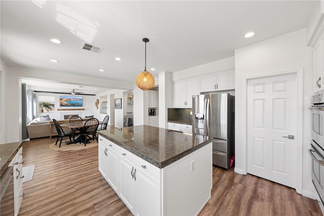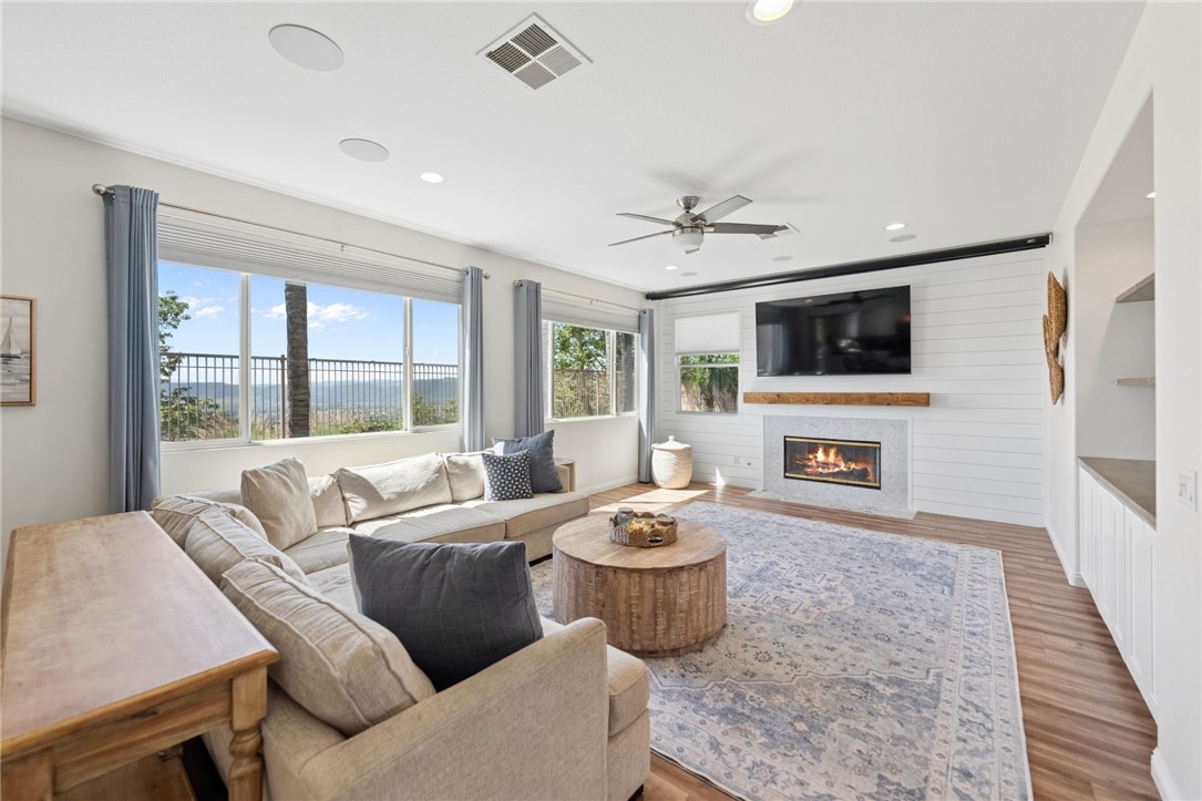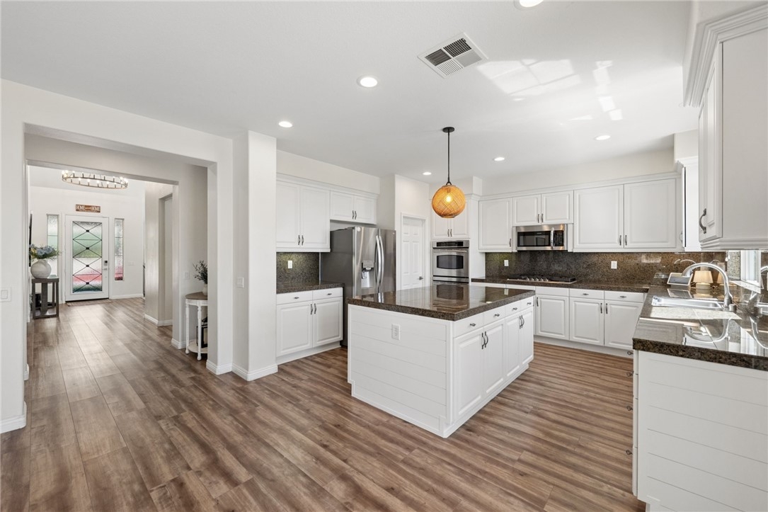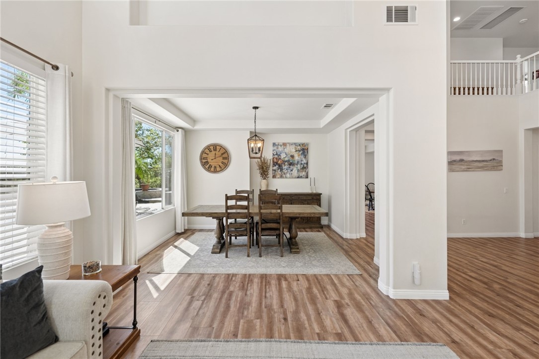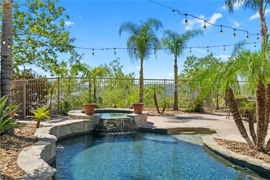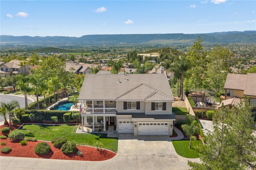 *PRIVATE POOL & SPA * STUNNING VIEWS * PRIVACY * LARGE LOT * GUARD-GATED COMMUNITY Set near the highest point in Greer Ranch on an expansive 11,761 sq ft lot, this exceptional 3,806 sq ft home showcases sweeping views of the Santa Rosa Plateau & Temecula Valley, with only one home above it. A long driveway, new landscaping, freshly painted exterior, updated wrought-iron glass front door & 3 car garage create a striking first impression. Inside, soaring 2 story ceilings, luxury vinyl plank floors & neutral interior paint set the stage, while the formal living & dining rooms are filled with natural light from expansive windows. The kitchen features granite counters, white cabinetry, stainless steel appliances & a walk-in pantry, opening to a beautifully updated farmhouse-style family room with shiplap accent wall, remodeled fireplace with wood mantle, custom built-in with floating shelves, recessed lighting, ceiling fan & dry bar with tile backsplash & beverage fridge. A wall-to-wall roll-up screen with hidden projector adds a fun touch for movie nights. The main floor offers a bedroom with ceiling fan & walk-in closet & includes an attached bath with walk-in shower, ideal for guests or multi-gen living, along with an additional upgraded 1/2 bath & laundry room with sink & abundant cabinetry off the 3 car garage with epoxy floors & hi-loft storage. Upstairs offers 3 secondary bedrooms (2 of them a Jack-n Jill), 2 baths & a large bonus room with wood floors, barnwood door entry & balcony. Privately situated away from the secondary bedrooms, the primary suite features double door entry, its own private balcony with stunning views, jetted tub, walk-in shower, make-up vanity & large walk-in closet. The backyard is a private haven with a saltwater pool & spa with fire bowls, grassy area, horseshoe pit & patio spaces to relax or entertain. Additional features include a Quiet Cool whole house fan, attic fan, NEST cameras & ADT pool security system. Located within the guard-gated Greer Ranch community with 24 hr security, scenic hiking & biking trails, parks, community pool & spa, and year-round neighborhood events. Enjoy convenient access to the 215 & 15 freeways, nearby shopping & dining, Old Town Temecula, Temecula wineries & the Promenade Mall, all w/in the highly regarded Murrieta school district. Don't miss this rare opportunity to own a pool & view home that blends privacy, space & everyday luxury.
