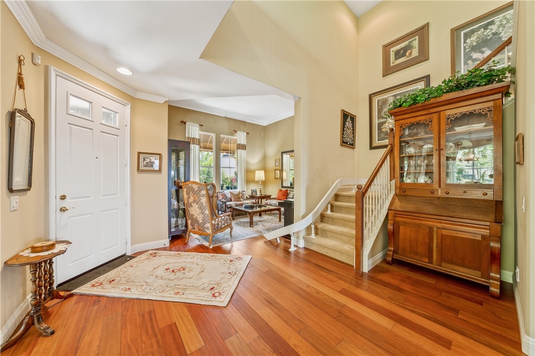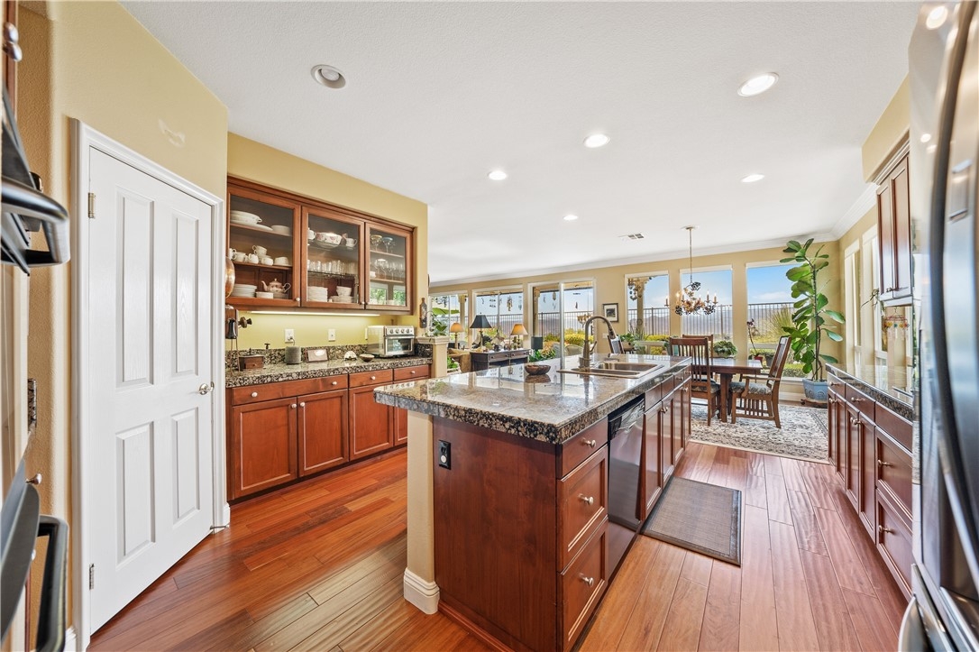 PANORAMIC VIEWS, AMAZING SUNSETS & TONS of PRIVACY! This TURNKEY home NESTLED at the VERY END of a CUL-DE-SAC & on ~ 1/3 ACRE in the GUARD GATED COMMUNITY of GREER RANCH has ~ 3,610 square ft. w/5 BR (1 DOWN), 3 FULL BATHS, a LOFT(with added ADDITION) & a 4 CAR GARAGE - making it ONE-OF-A KIND! The curb appeal WOWS w/ a NEWLY INSTALLED & UPGRADED GARAGE DOOR, a SPACIOUS COURTYARD w/ the feel of a "GARDEN OASIS"-an abundance of DROUGHT TOLERANT LANDSCAPING w/VIEWS of the HILLS, & lots of parking(with your own "turn-about" in the driveway). Sipping your morning coffee on your tiled front porch & tastefully added hardscaping should be relaxing, indeed. Out back, enjoy the shade under your patio cover, ceiling fans, the STUNNING VIEWS including the Santa Rosa Plateau, & the peacefulness of the trickling fountain. Inside you'll find that these ORIGINAL OWNERS keep an IMMACULATE house. You'll be greeted by a separate living and dining room, WOOD FLOORS, CROWNE MOULDING, & neutral painted walls. The kitchen offers a LARGE ISLAND w/ bar seating, double ovens, & walk-in pantry. Kitchen is open to the spacious family rm w/ a BUILT-IN, FIREPLACE and ceiling fan & has TONS of WINDOWS giving you GREAT VIEWS into your BACKYARD & BEYOND! The separate laundry rm includes a sink, and LOTS of STORAGE! The MAIN FLOOR BEDROOM has a walk-in closet & ceiling fan & is conveniently located to the MAIN FLOOR BATH w/ shower- making it a great guest bedroom. And for those of you who like EXTRA STORAGE or space to store those antique cars or do woodworking, you'll just love this EPOXY FLOOR- 4 CAR GARAGE w/ 220V for charging an ELECTRIC VEHICLE. Upstairs & down the hall (w/built-in desk & large linen area),there are 3 additional bedrooms all w/ mirrored wardrobes & ceiling fans and the secondary bath w/dual sinks. At the top of the stairs, find a LOFT area & an ADDITIONAL ROOM off the loft(could be converted into a 6th private bedroom if so desired). This additional room has a PICTURESQUE FLOOR-to-CEILING WINDOW. The MSTR. BDRM. has a separate retreat area, ceiling fan, & BALCONY. The MSTR. BA has a soaking tub, separate shower, dual sinks, & spacious walk-in closet. Home also has a WATER SOFTENER, NEST thermostats, SHUTTERS, AUTOMATED WINDOW SHADES, & WHOLE HOUSE FAN. Greer Ranch has 24 HOUR SECURITY, COMMUNITY POOL, SPA, HIKING TRAILS, PARKS & MUCH MORE and is located within the TOP-RATED Murrieta School District. Easy access to both the 15 &215 FWY and lots of shopping.